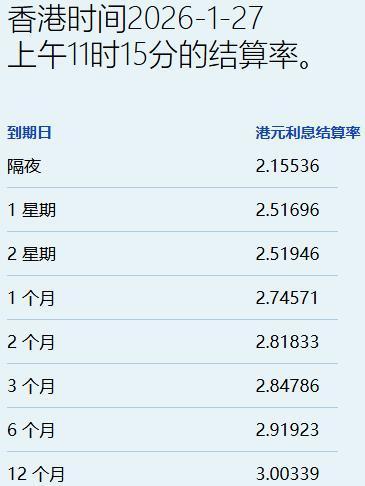 智通财经APP获悉,1月27日,港元拆息个别发展上升浪,而与楼按相关的一个月拆息连跌三日报2.74571%,跌3.596基点;反映银行资金成本的三个月拆息报2.84786%,跌0.851基点。